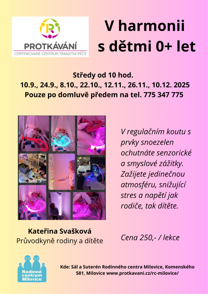 Prožijte harmonii s dětmi ve věku 0-3 roky každou druhou středu v Rodinném centru Milovice. Akce vedená průvodkyní Kateřinou Svaškovou nabízí hravé aktivity přizpůsobené dětskému vnímání, senzorické a pohybové zážitky a regulační kout s prvky snoezelen. Účast možná po telefonické domluvě na uvedeném telefonním čísle